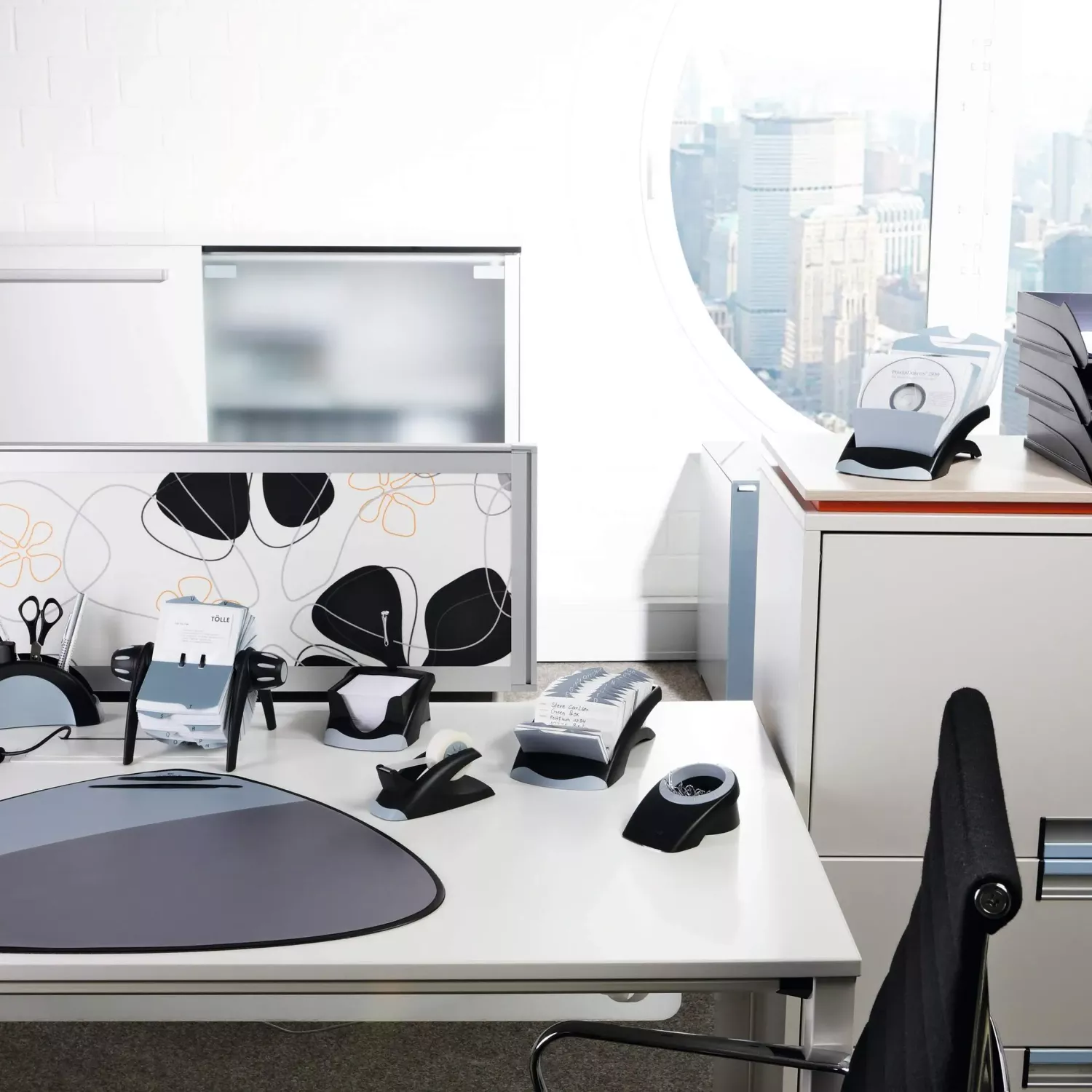Den stilrena designen i svart gör att adresskortshållaren passar perfekt på kontor, i receptioner eller andra arbetsmiljöer där man vill ha snabb och enkel tillgång till kontaktinformation.