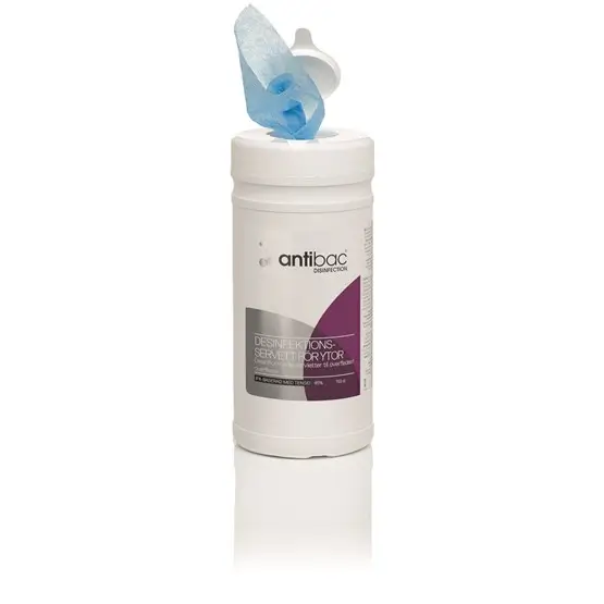 Antibac Ytdesinfektionsservett IPA är en mjuk, rengörande och desinficerande servett avsedd för effektiv desinfektion av beröringsytor. Servetterna innehåller cirka 45 % isopropylalkohol (IPA) i kombination med tensid, vilket gör att de både rengör och desinficerar i ett och samma moment.