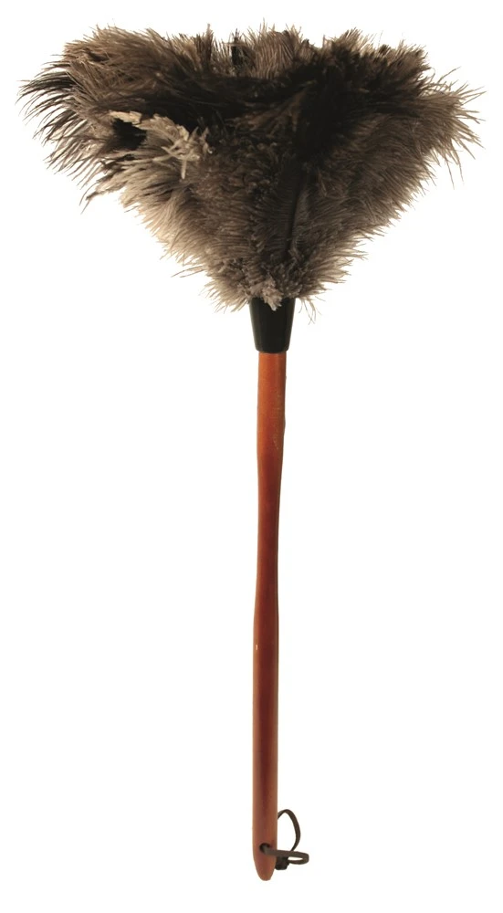 Dammvippa med 45 cm långt träskaft, läderhängare upptill och strutsfjädrar. Fjädrarna blir statiska när de dras mot ytan och fångar effektivt upp dammet. Perfekt till lampor, bokhyllor, tavlor m.m.