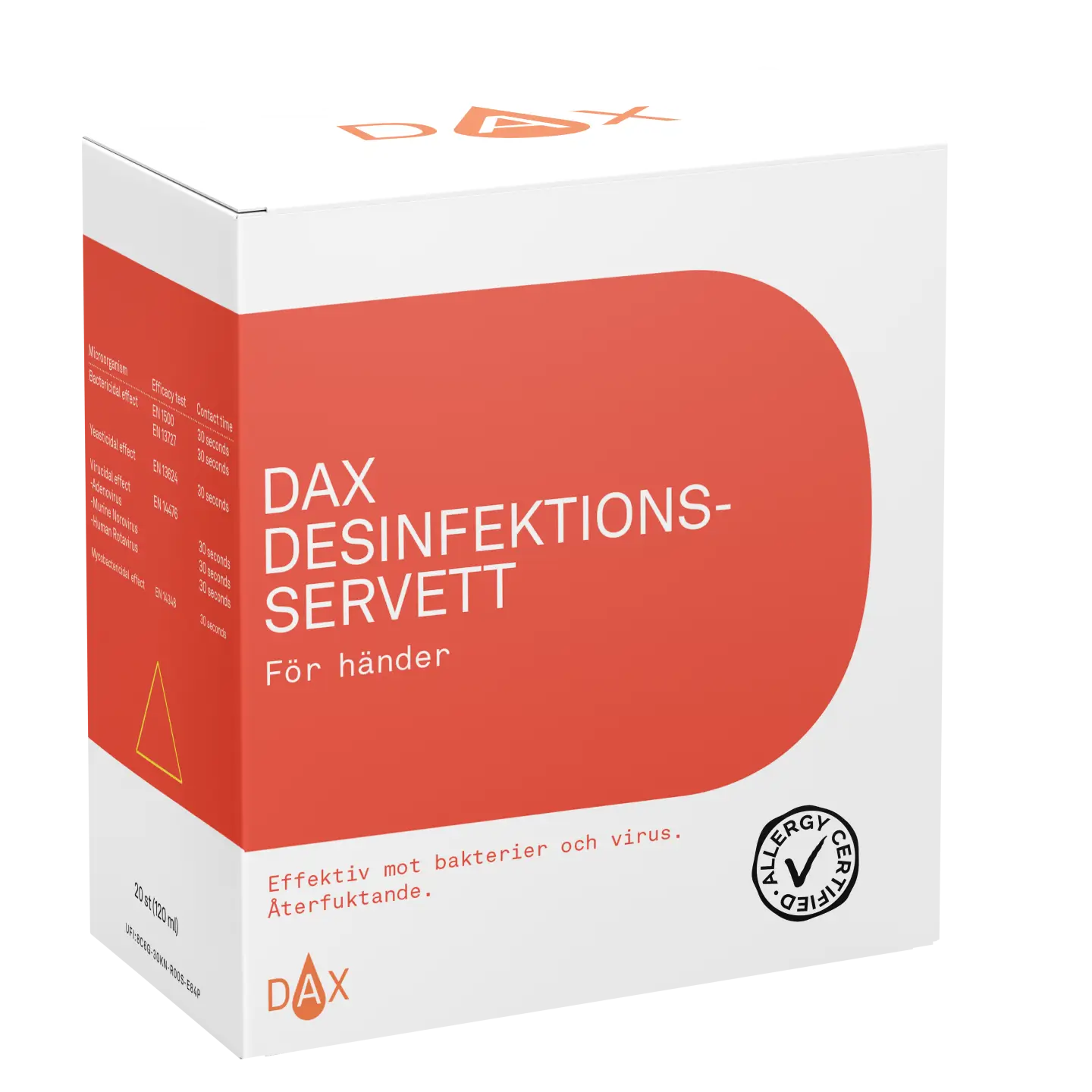 DAX Desinfektionsservett för händer är en mjuk och följsam singelförpackad våtservett indränkt med cirka 75 % denaturerad etanol. Den är enkel att använda – även för personer som inte är vana vid handsprit – och är praktisk att bära med sig i väskan, på resan eller inom vård och omsorg.