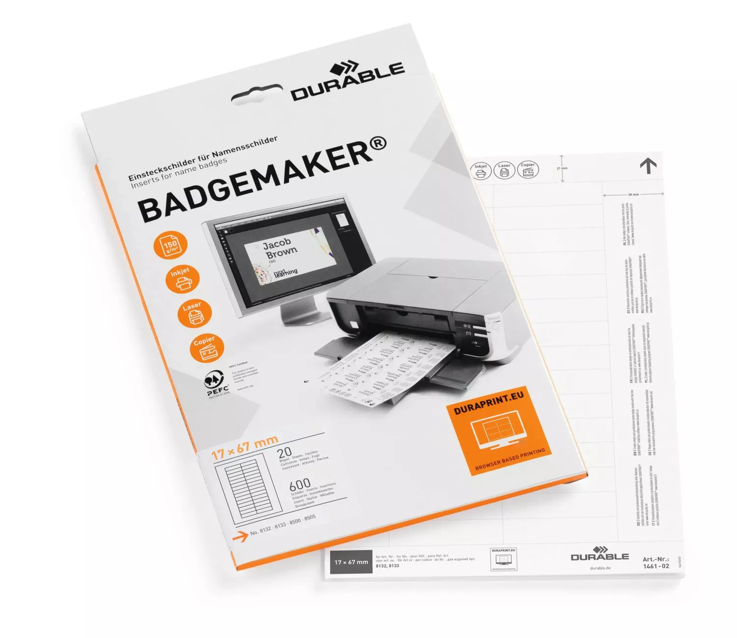 Etiketterna passar utmärkt för konferenser, möten, event och receptioner där tydlig och enhetlig märkning behövs. De är kompatibla med DURABLE art.nr 8132, 8133, 8500 och 8505 och kan utformas i gratisprogrammet DURAPRINT®. Utskrift kan göras i laser- eller bläckstråleskrivare samt kopiator.