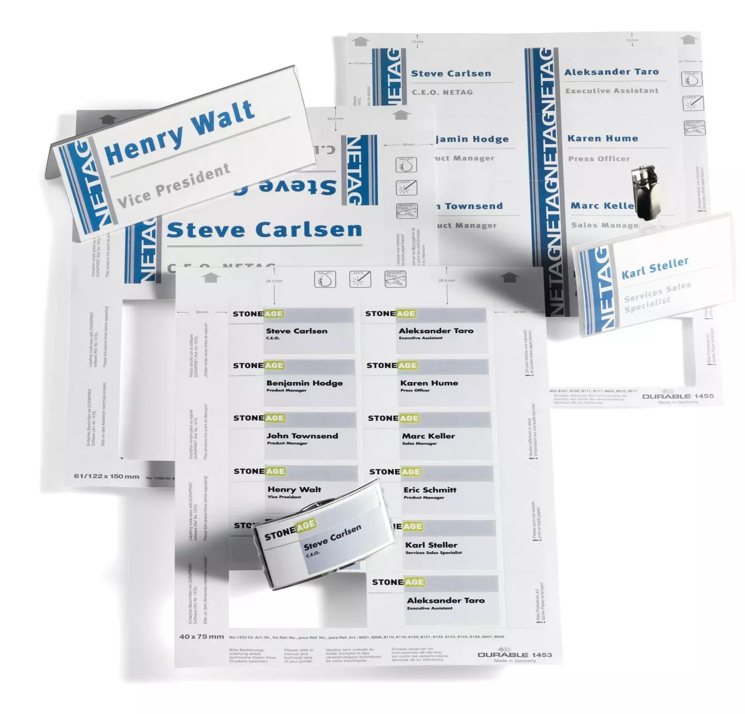 BADGEMAKER® insticksetiketter är ett praktiskt val för professionell märkning av namnskyltar vid konferenser, möten, event eller i receptioner. Etiketterna levereras på A4-ark och gör det enkelt att snabbt skapa tydliga och personliga namnskyltar. Med hjälp av det kostnadsfria programmet DURAPRINT® kan du enkelt designa och skriva ut etiketter i både laser- och bläckstråleskrivare.
