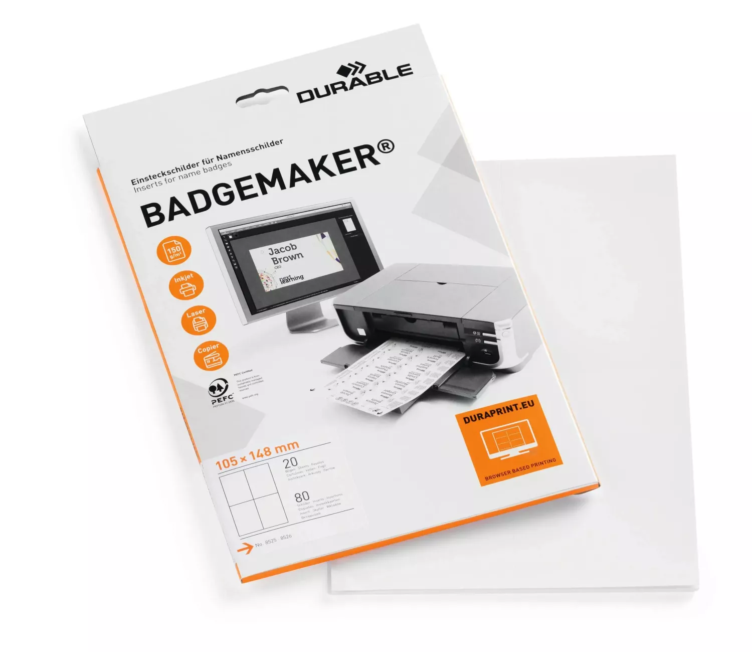 Med hjälp av det kostnadsfria designprogrammet DURAPRINT® kan du snabbt skapa professionella och personliga namnskyltar. Etiketterna skrivs ut i laser- eller bläckstråleskrivare och passar särskilt bra till Durable bordsnamnskyltar art.nr 8525 och 8526. De kan även användas separat som bordsplacering eller bordsskyltar vid evenemang.