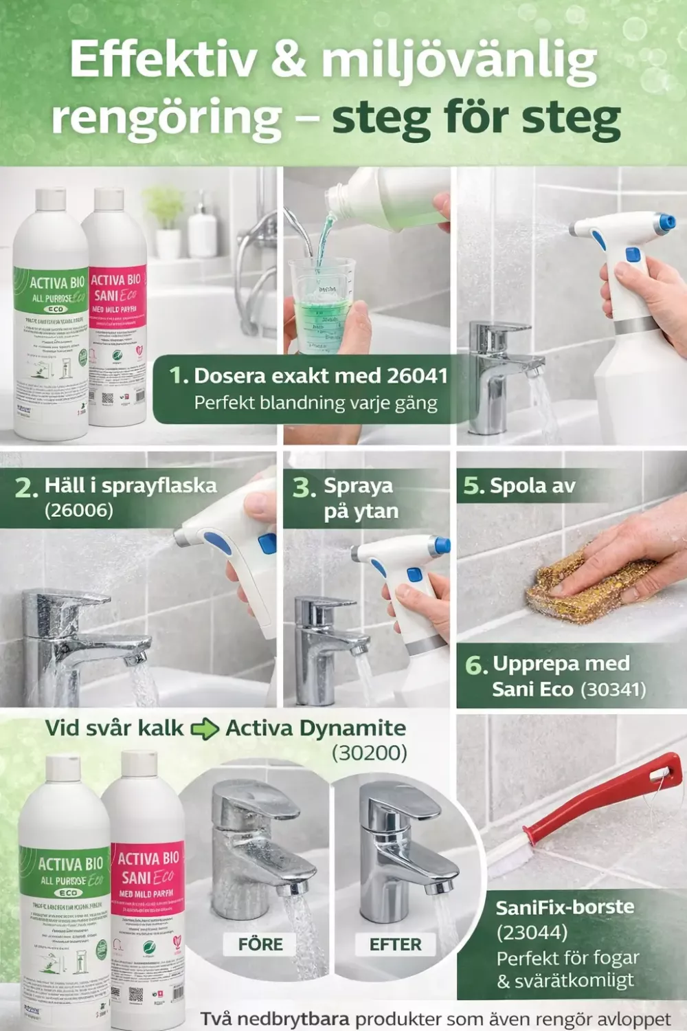 Letar du efter en effektiv lösning för att ta bort kalk i duschen, fettbeläggningar och tvålrester i badrummet? Med vårt kompletta rengöringssystem från Activa får du en kraftfull och samtidigt miljövänlig rengöring som passar både hem och professionell användning.