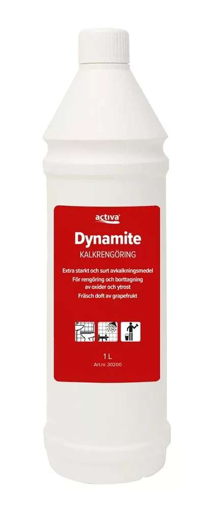 Vid behov av kraftigare rengöring, exempelvis vid hårt sittande kalk i duschen, används Activa Dynamite (30200). För detaljer och fogar rekommenderas Sanifix-borste (23044).