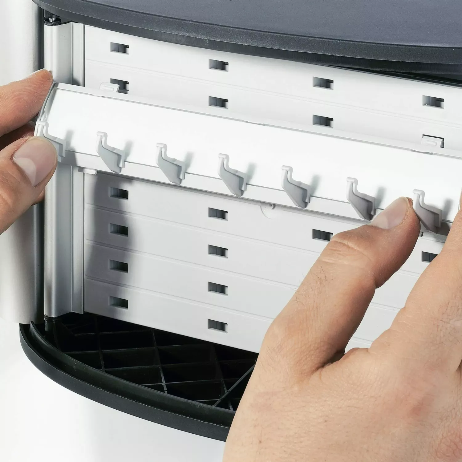 Den smarta lösningen med KEY CLIP-nyckelbrickor gör att nyckeln hänger bakom brickan medan märkningen syns tydligt i det transparenta etikettfältet. Detta ger en snabb överblick och gör det enkelt att hitta rätt nyckel. På insidan av dörren finns även en innehållsförteckning för bättre organisation.
