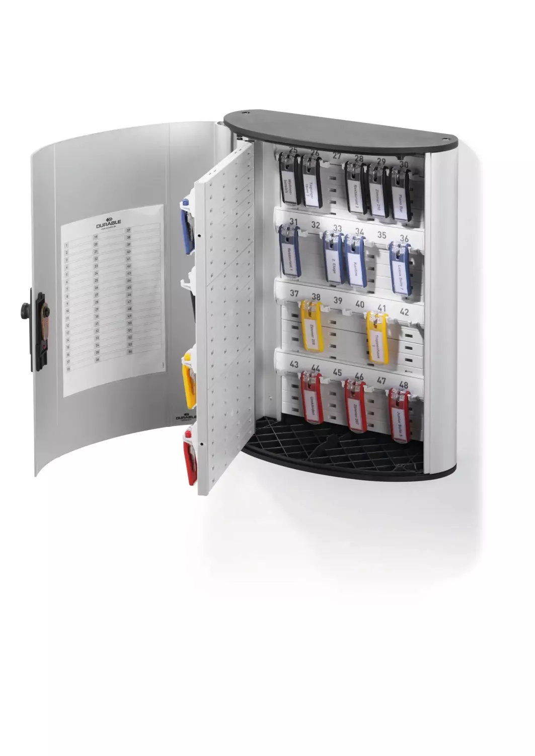 Skåpet levereras med 6 färgade nyckelbrickor och ett komplett monteringsset för väggmontering. På insidan av dörren finns en överskådlig innehållsförteckning för enkel administration av nycklar.