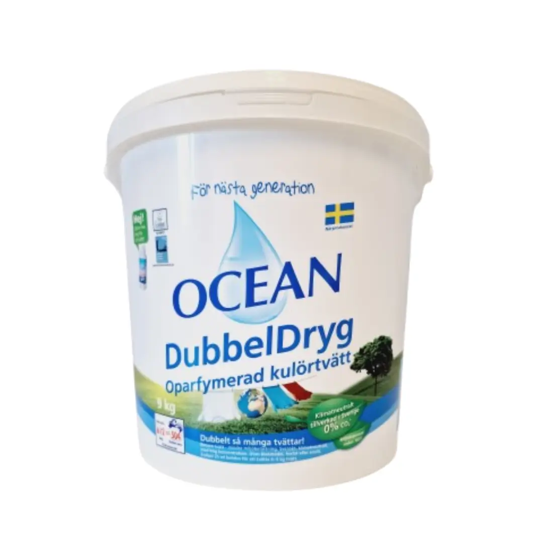 OCEAN DubbelDryg Oparfymerad Hink 9 kg är ett högkoncentrerat tvättmedel som är dubbelt så drygt som många andra tvättmedel på marknaden. Den höga halten aktiva ämnen gör att du kan använda en mindre mängd pulver per tvätt, vilket ger både effektiv rengöring och lång hållbarhet.
