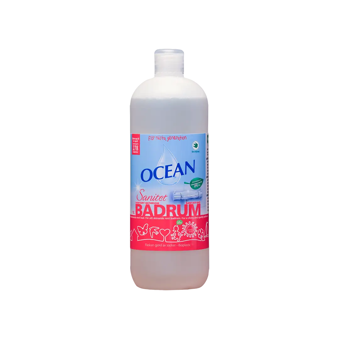 OCEAN Sanitet Badrum är ett miljövänligt rengöringsmedel med fräsch doft, särskilt utvecklat för badrumsrengöring. Produkten innehåller mjölksyra som effektivt avlägsnar kalkavlagringar, mögel och annan smuts.