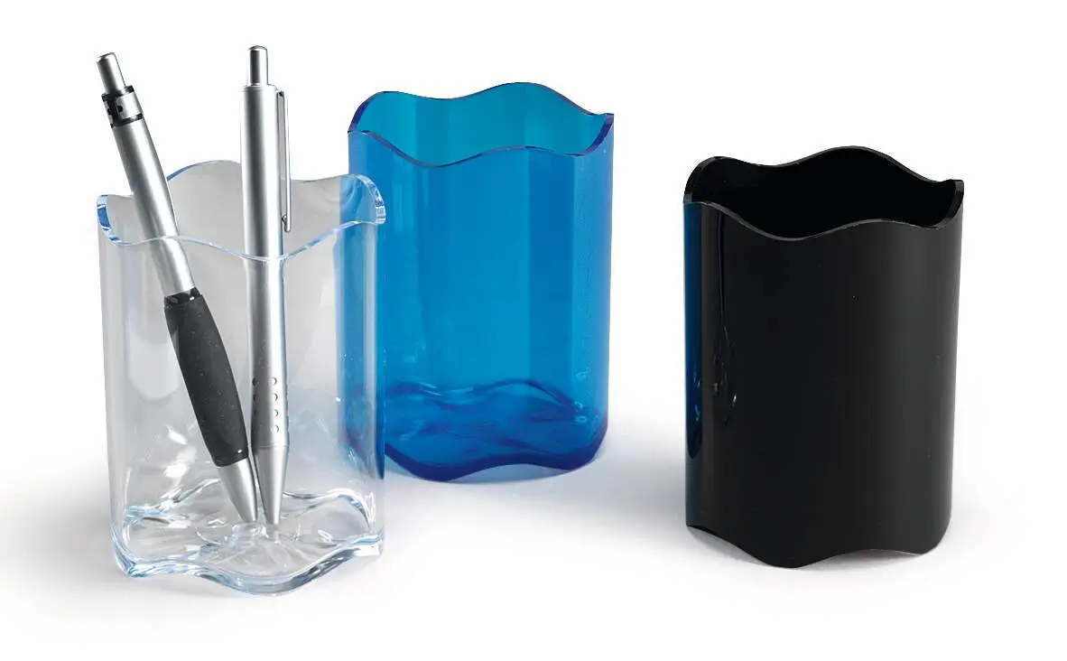 Pennställ TREND är en smidig och funktionell lösning för att organisera pennor, saxar, linjaler och andra skrivbordstillbehör. Den stilrena designen med böljande kant ger ett modernt intryck samtidigt som den håller ordning på arbetsytan. Tillverkad i slitstark plast och passar lika bra på kontoret som i hemmiljö.