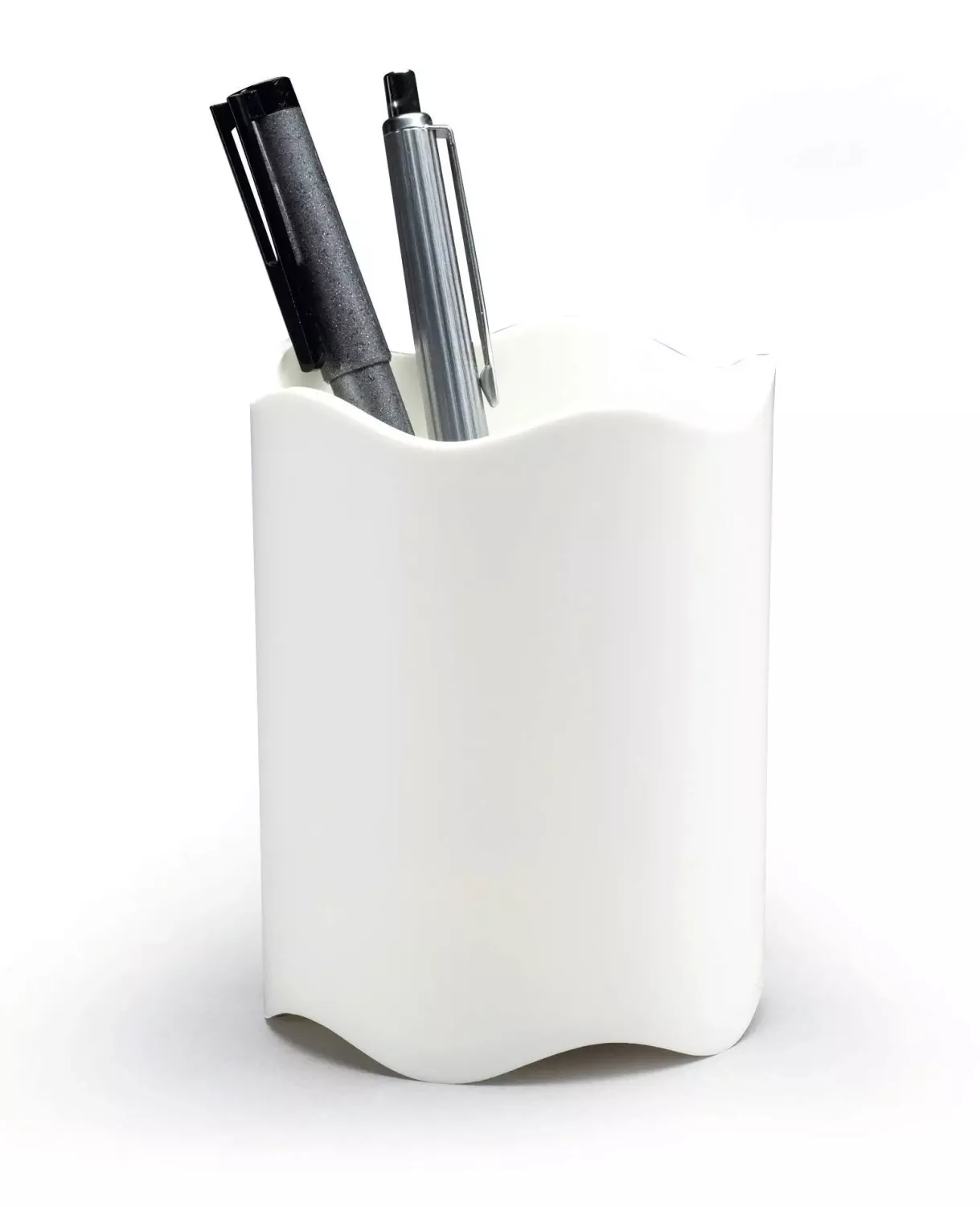 Praktiskt och stilrent pennställ i vit plast med dekorativ böljande kant. Perfekt för att organisera pennor, saxar, linjaler och andra skrivbordstillbehör. Den kompakta designen gör att den passar på alla typer av skrivbord – både hemma och på kontoret.
