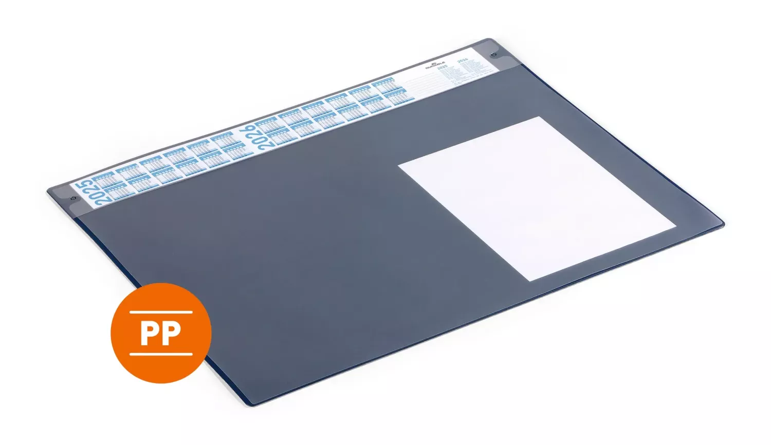 Den smala årskalendern med översikt för fyra år gör det enkelt att snabbt kontrollera datum och planera arbetet. Tack vare den halkfria undersidan ligger underlägget stabilt på bordet utan att glida, vilket ger en bekväm och säker arbetsyta.