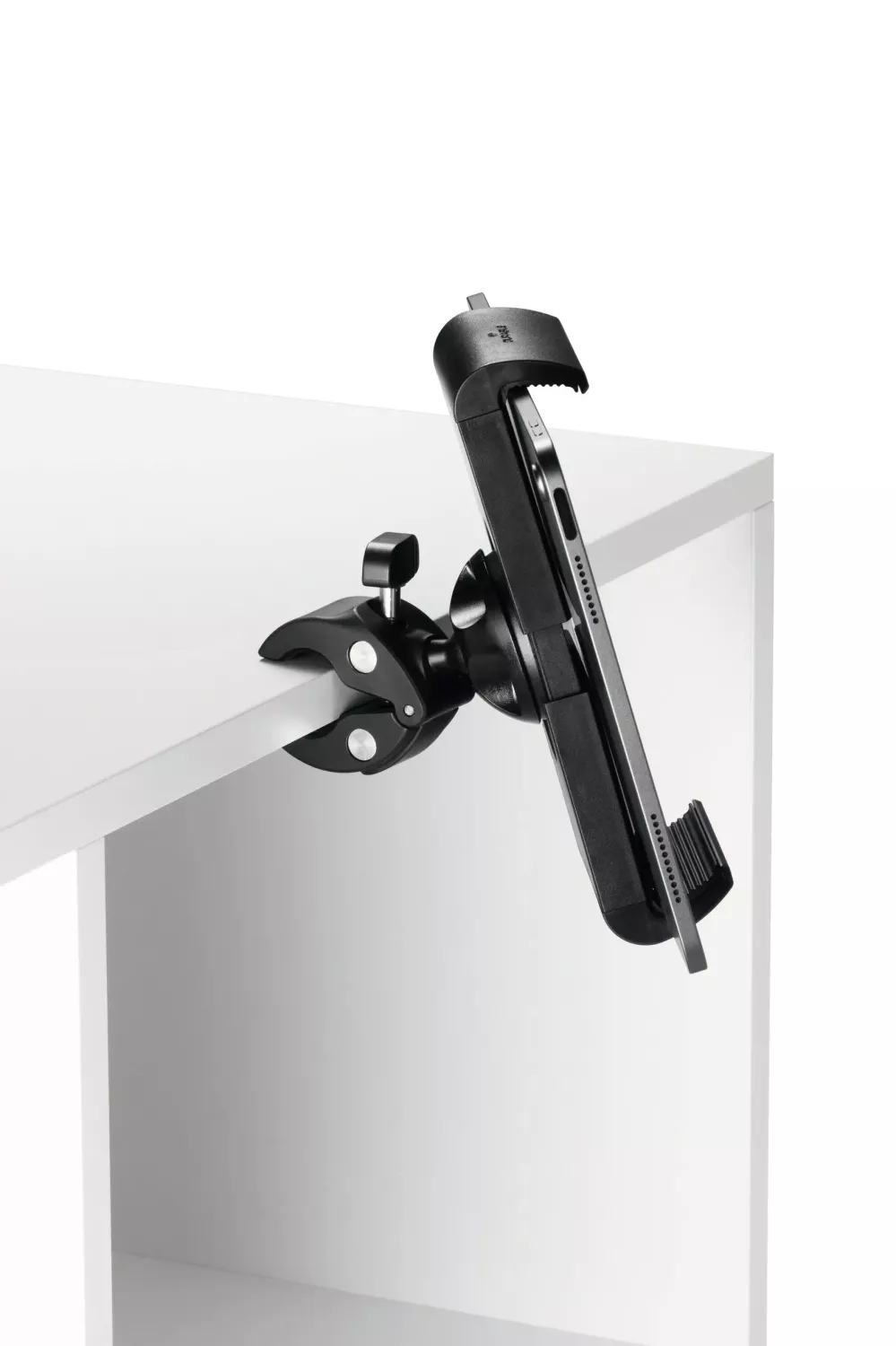Robust och flexibel surfplattehållare för professionell användning inom industri, lager och städ. Utrustad med kulled och böjbar svanhals som gör det enkelt att justera surfplattan i önskad vinkel. Den extra djupa modulen gör att surfplattan sitter stadigt, både med och utan fodral. Monteras enkelt på hyllplan, bordsskivor eller rör/stänger, vilket gör den mycket mångsidig i olika arbetsmiljöer. Gummerade ytor skyddar enheten mot repor och skador.