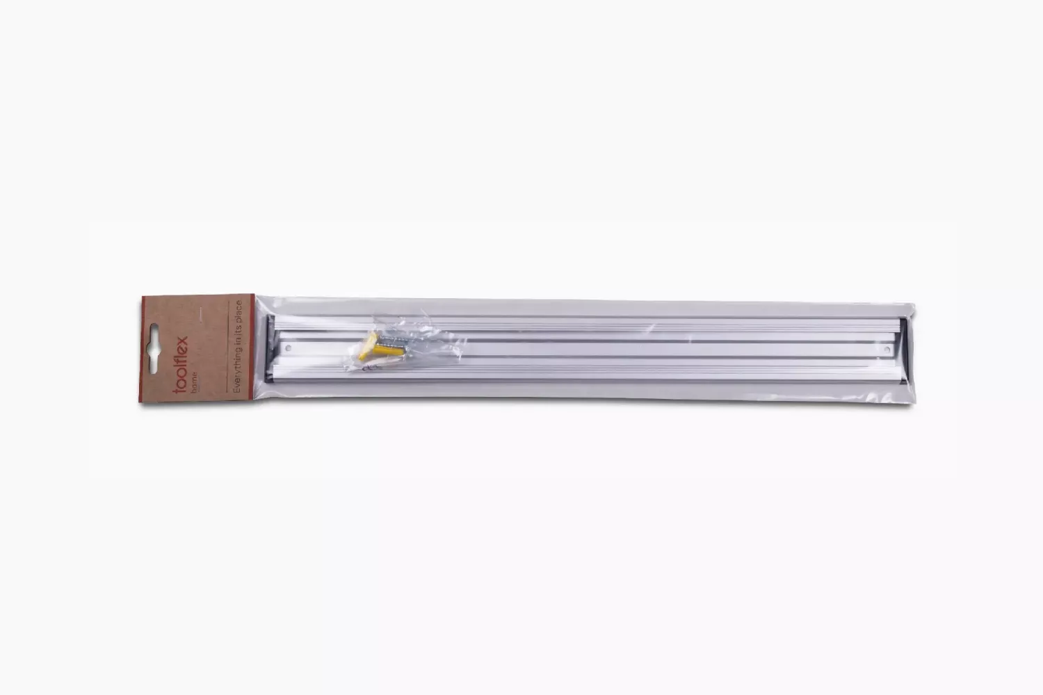 Hållarna kan monteras direkt på vägg med medföljande skruv och plugg eller användas tillsammans med Toolflex Original aluminiumskena (köpes separat).