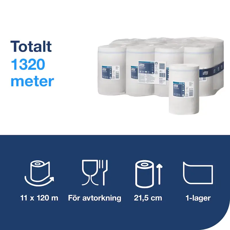 Tork Avtorkningspapper 1-lag är ett mångsidigt och funktionellt papper som passar perfekt för lättare avtorkning samt handavtorkning i olika arbetsmiljöer. Pappret används i Tork® Dispenser Mini Centrummatad, en kompakt och flexibel lösning som lämpar sig för miljöer där både hand- och ytavtorkning krävs. Produkten är idealisk för avtorkning av händer och lätt smutsade ytor samt särskilt lämplig för rengöring av glas, då den inte lämnar ludd eller ränder. Den obegränsade utmatningen gör att användaren kan ta så mycket papper som behövs, och tack vare att pappret är enkelt att använda med en hand blir arbetet smidigt även i högt tempo. Tork slutindikator hjälper till att planera rullbyten och minska risken för avbrott. Pappret produceras utan fossila koldioxidutsläpp.