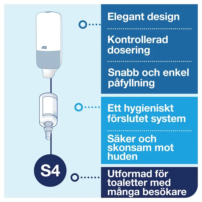 Tork Skincare Dispenser S4 Rostfri är utvecklad för miljöer med höga krav på både design och hygien. Den stilrena dispensorn i rostfritt stål är enkel att använda och påfyllning sker snabbt med fabriksförseglade refiller. Kombinationen av hög kapacitet, hygienisk säkerhet och hållbar design gör den idealisk för både offentliga miljöer och premiumverksamheter.