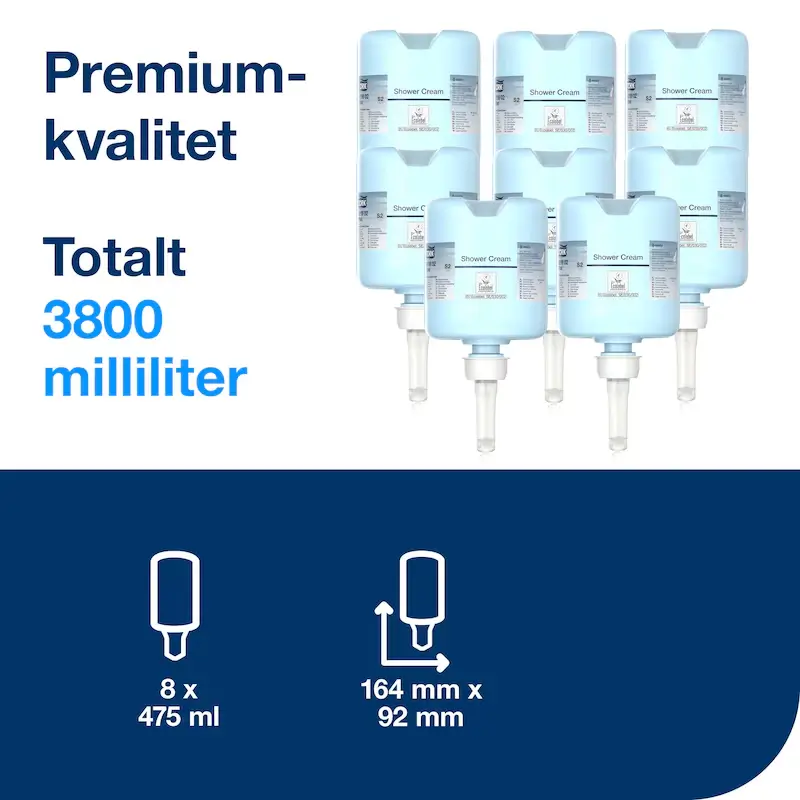 Tork Flytande Duschcreme Mini S2 är utvecklad för professionella och offentliga miljöer där god hudvård är viktigt. Den skonsamma, snabbtorkande formulan fungerar i alla Tork Dispensrar Flytande Tvål Mini som är Easy to use-certifierade, vilket gör duschcremen enkel att använda för alla användare.