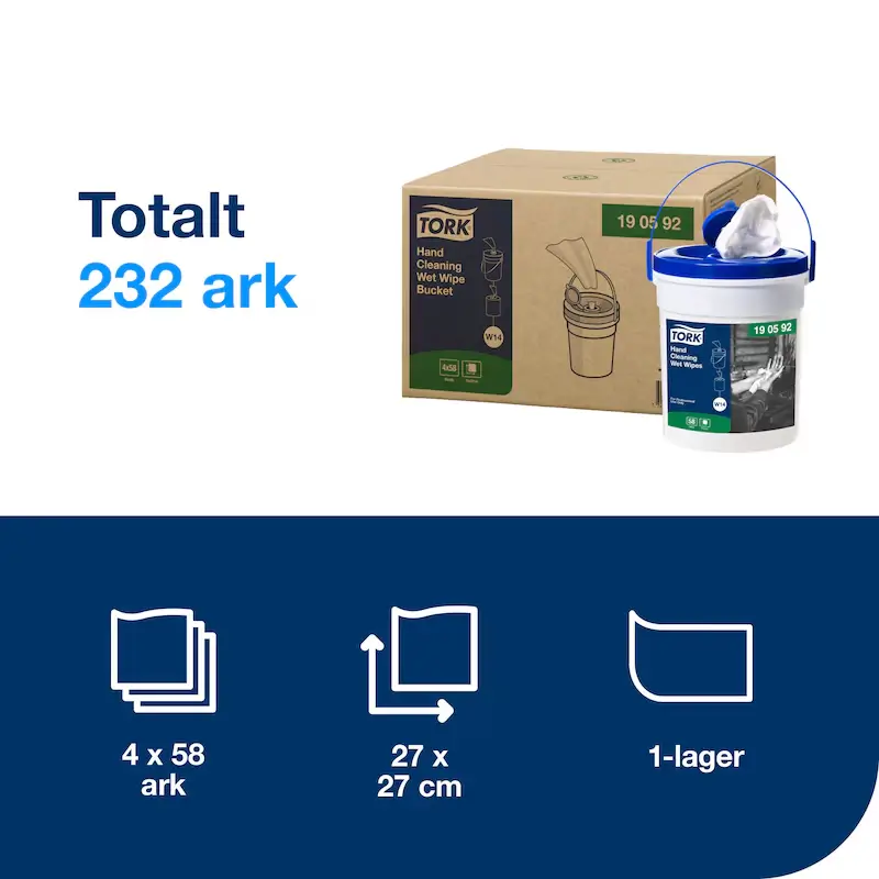 Tork Våtdukar för Handrengöring är en praktisk och hygienisk lösning för handtvätt när tillgång till vatten saknas. Våtdukarna håller proffskvalitet och rengör händerna effektivt samtidigt som de är skonsamma mot huden. De är oparfymerade och milda, vilket gör dem lämpliga för frekvent användning i både professionella miljöer och vid mobilt arbete. Levereras i en smidig bärbar hink för enkel hantering och förvaring.