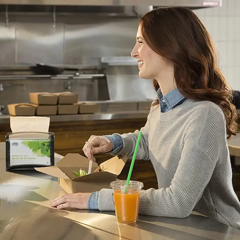 Tork Xpressnap® Advanced Natur Dispenserservett N4 är en 1-lagers servett tillverkad av 100 % återvunnet papper, framtagen för snabbmatsrestauranger och självserveringsmiljöer med hög genomströmning. Tack vare Xpressnap®-systemet matas en servett ut i taget, vilket minskar förbrukningen med minst 25 % jämfört med traditionella servettdispensrar – samtidigt som hygienen förbättras.